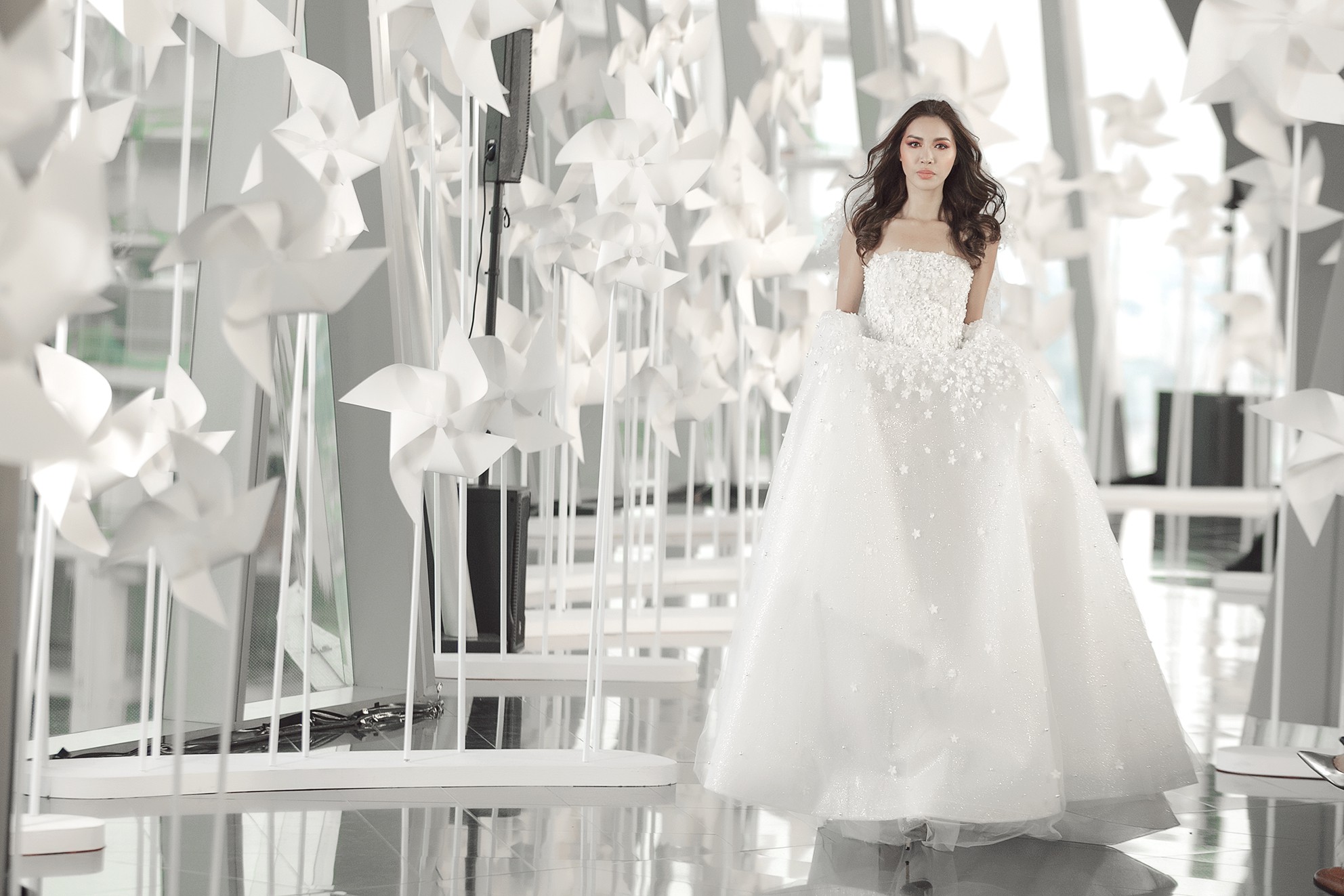 Giữa không gian trắng bong khôi với những chiếc chong chóng đáng yêu, BST "Phong" của NTK gốc Đà Nẵng đã thực sự chinh phục được giới mộ điệu.